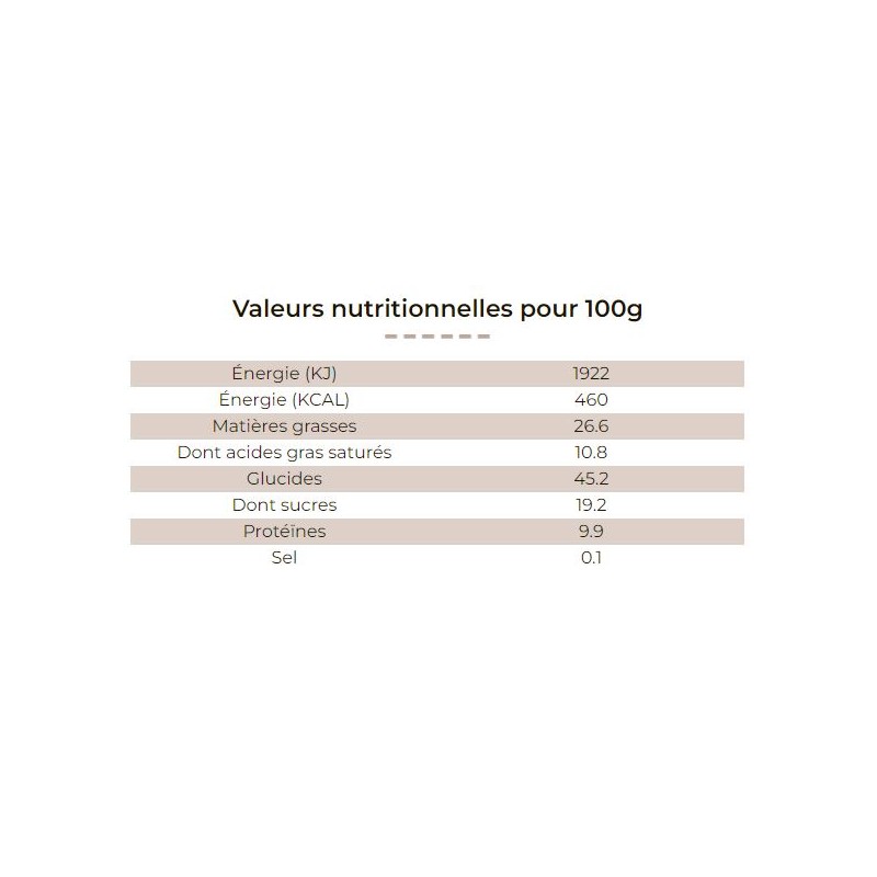Valeurs énergétique moyennes pour 100g: 1870kj/447kcal matières grasses 25.2g dont acides gras saturés 11.0g,glucides 47.2g dont sucres 19.2g,protéines 7.2g, sel 0.1g
